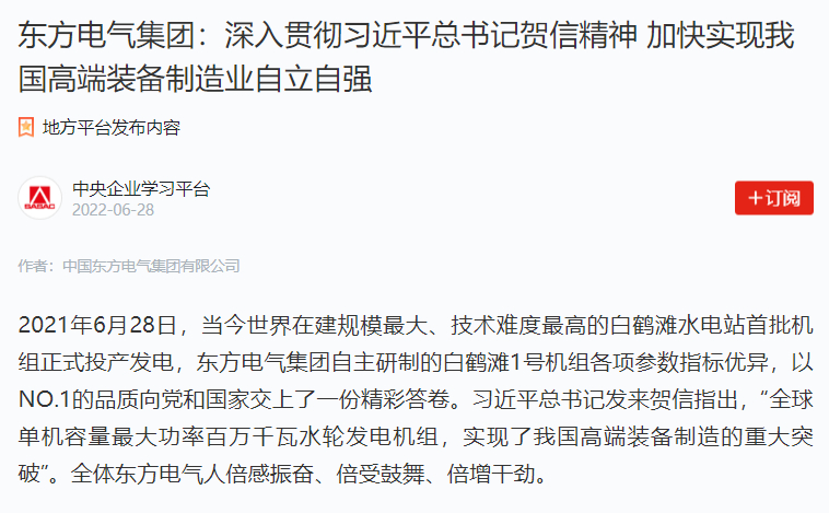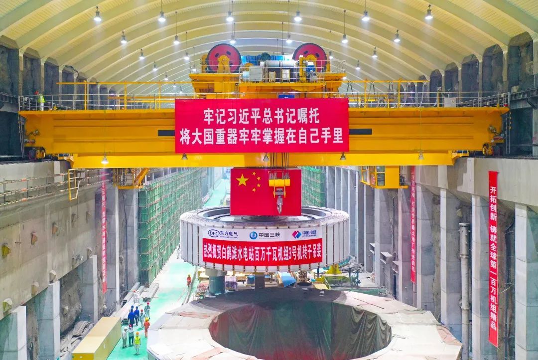 2021年6月28日,當(dāng)今世界在建規(guī)模最大、技術(shù)難度最高的白鶴灘水電站首批機(jī)組正式投產(chǎn)發(fā)電,東方電氣集團(tuán)自主研制的白鶴灘1號機(jī)組各項參數(shù)指標(biāo)優(yōu)異,以NO.1的品質(zhì)向黨和國家交上了一份精彩答卷。習(xí)近平總書記發(fā)來賀信指出,“全球單機(jī)容量最大功率百萬千瓦水輪發(fā)電機(jī)組,實現(xiàn)了我國高端裝備制造的重大突破”。全體東方電氣人倍感振奮、倍受鼓舞、倍增干勁。