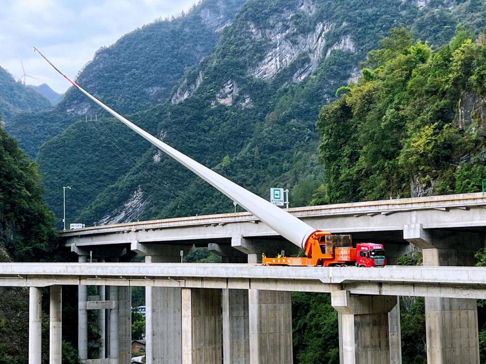2021年11月,葉片揚(yáng)舉車執(zhí)行重慶市石柱石家風(fēng)電項(xiàng)目運(yùn)輸。(東方電氣資料圖片)