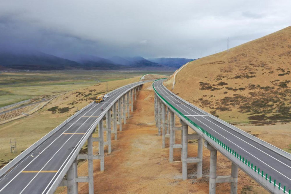 京藏高速那曲至羊八井段堆巴果大橋(2021年5月29日攝 無(wú)人機(jī)照片)。新華社發(fā)(胡雪峰 攝)