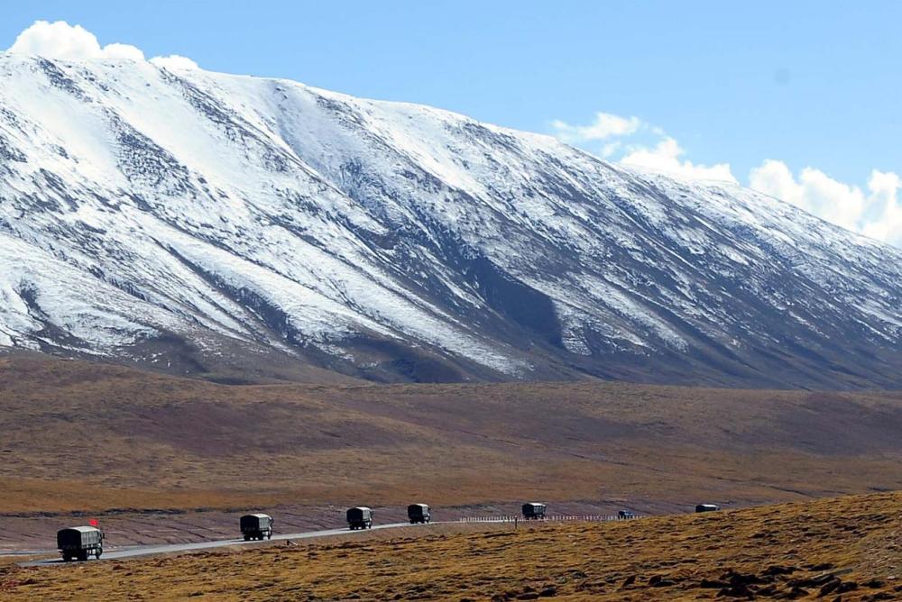 2014年9月27日,一個(gè)車(chē)隊(duì)行駛在通往唐古拉山口的途中。青藏公路像一條潔白的哈達(dá),橫亙?cè)谄骄0?000米以上的青藏高原。新華社記者 王頌 攝
