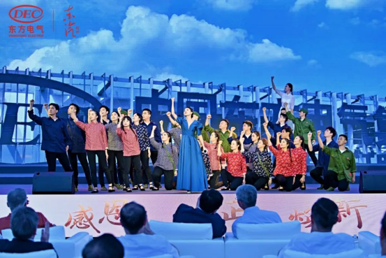 情景展演《脊梁之上》藝術(shù)地再現(xiàn)了東方電氣從堅(jiān)苦卓絕的三線創(chuàng)業(yè),到經(jīng)歷磨難后的涅槃重生,再到新時(shí)代勇攀高峰、服務(wù)國家戰(zhàn)略的壯麗畫卷。