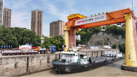 樂(lè)山大件碼頭作為四川大件運(yùn)輸水陸轉(zhuǎn)換樞紐,地處三江匯流下游,航道水深穩(wěn)定、江面寬闊,具備千噸級(jí)通航條件。自1995年為服務(wù)三峽樞紐工程興建以來(lái),已成為長(zhǎng)江經(jīng)濟(jì)帶重要物流節(jié)點(diǎn)。利用碼頭配備的550噸橋式起重機(jī),球閥與中壓模塊將在這里完成吊裝轉(zhuǎn)運(yùn)的全過(guò)程?!安捎脴蚴狡鹬貦C(jī),是因?yàn)榇a頭固定軌道作業(yè)穩(wěn)定,能最大程度保障設(shè)備安全?!睎|方大件物流技術(shù)部技術(shù)經(jīng)理羅崎瑞介紹說(shuō),“單件設(shè)備上船后需要花1小時(shí)進(jìn)行加固作業(yè),確保航行中萬(wàn)無(wú)一失。”