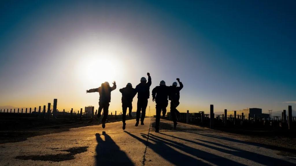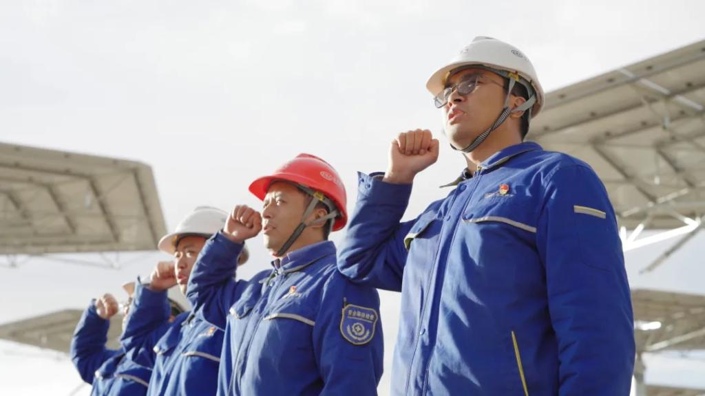 “立邊疆、戰(zhàn)戈壁、斗酷暑、抗嚴(yán)冬,誓要啃下這塊硬骨頭?!笔枪鉄釄F(tuán)隊(duì)對(duì)自己的激勵(lì),也是他們對(duì)用戶的承諾。從集光到追光,這支年輕的團(tuán)隊(duì)留下了鏗鏘有力的奮斗印記,成功攻克多項(xiàng)“卡脖子”技術(shù),最終掌握了高效利用太陽(yáng)能的“綠色原理”。2021年6月18日,哈密光熱項(xiàng)目正式開啟“24小時(shí)不間斷”發(fā)電模式。如今,14500臺(tái)閃閃發(fā)光的五邊形定日鏡優(yōu)雅的矗立在蒼穹之下,如同向日葵,追逐著太陽(yáng),點(diǎn)亮了萬(wàn)家燈火。主動(dòng)請(qǐng)纓 義無(wú)反顧挑戰(zhàn)“生命禁區(qū)”當(dāng)哈密的璀璨星空映照著萬(wàn)家燈火,阿克塞的11960朵“向日葵”正悄然綻放在四十里戈壁,與光伏“海洋”交相輝映。在這份“金色答卷”的背后,卻有著不為人知的艱辛與付出。在甘肅酒泉阿勒騰鄉(xiāng)的廣袤土地上,喧囂的工地現(xiàn)場(chǎng),一群身著藍(lán)色工作服的人正在穿梭其中。這里是海拔2900米的阿克塞,也是東方電氣首個(gè)自主知識(shí)產(chǎn)權(quán)的110兆瓦光熱項(xiàng)目建設(shè)現(xiàn)場(chǎng)。