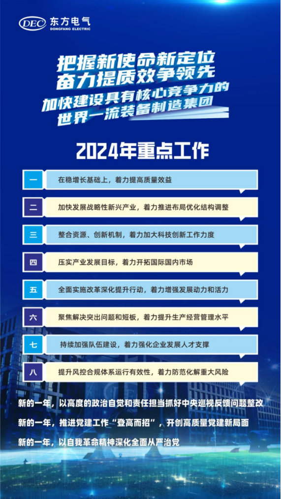 俞培根指出,2024年是落實“領(lǐng)先戰(zhàn)略”和“11256”發(fā)展戰(zhàn)略,推進集團公司轉(zhuǎn)型發(fā)展的關(guān)鍵之年,做好全年的工作尤為重要。全集團要堅持以習近平新時代中國特色社會主義思想為指導,全面貫徹落實黨的二十大和二十屆二中全會、中央經(jīng)濟工作會議精神,深入貫徹落實習近平總書記關(guān)于國有企業(yè)改革發(fā)展和黨的建設(shè)重要論述,認真貫徹落實習近平總書記“弘揚可貴的‘東汽精神’”“做排頭兵、走在前列”的重要要求,把握國資央企新使命新定位,完整、準確、全面貫徹新發(fā)展理念,更好服務加快構(gòu)建新發(fā)展格局、推進新型工業(yè)化,堅持穩(wěn)中求進、以進促穩(wěn)、先立后破,增強核心功能、提高核心競爭力,落實“領(lǐng)先戰(zhàn)略”,強化創(chuàng)新驅(qū)動,提升經(jīng)濟效益,持續(xù)推動集團公司高質(zhì)量發(fā)展,實現(xiàn)生產(chǎn)經(jīng)營質(zhì)的有效提升和量的合理增長,加快建設(shè)具有核心競爭力的世界一流裝備制造集團。