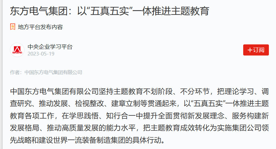 中國東方電氣集團有限公司堅持主題教育不劃階段、不分環(huán)節(jié),把理論學(xué)習(xí)、調(diào)查研究、推動發(fā)展、檢視整改、建章立制等貫通起來,以“五真五實”一體推進主題教育各項工作,在學(xué)思踐悟、知行合一中提升全面貫徹新發(fā)展理念、服務(wù)構(gòu)建新發(fā)展格局、推動高質(zhì)量發(fā)展的能力水平,把主題教育成效轉(zhuǎn)化為實施集團公司領(lǐng)先戰(zhàn)略和建設(shè)世界一流裝備制造集團的具體行動。