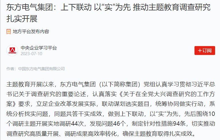 主題教育開展以來,東方電氣集團(tuán)(以下簡稱集團(tuán))黨組認(rèn)真學(xué)習(xí)貫徹習(xí)近平總書記關(guān)于調(diào)查研究的重要論述,認(rèn)真落實《關(guān)于在全黨大興調(diào)查研究的工作方案》要求,立足企業(yè)改革發(fā)展實際,聯(lián)動謀劃選實題目,統(tǒng)籌協(xié)同做實行動,系統(tǒng)分析找實問題,同題共答干實成效,做到上下聯(lián)動,以“實”為先,先后圍繞10個調(diào)研主題開展實地調(diào)研44次,發(fā)現(xiàn)問題46個,制定針對性措施94條,切實推動調(diào)查研究高質(zhì)量開展、調(diào)研成果高效率轉(zhuǎn)化,確保主題教育取得扎實成效。